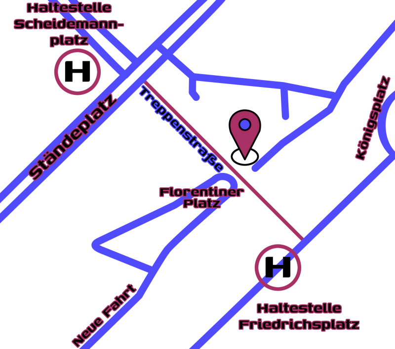Kommst Du mit öffentlichen Verkehrsmitteln zu uns, kannst Du entweder am Friedrichsplatz aussteigen und die Treppenstraße hoch gehen oder Du steigst am Scheidemannplatz aus und gehst die Treppenstraße ein Stück runter.